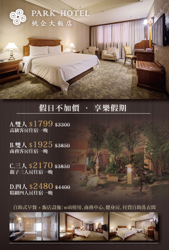 只要1799元起,即可享有【桃園-桃企大飯店】假日不加價 ? 享樂假期AB.雙人/C.三人/D.四人住宿專案〈含A.高級客房/B.商務客房/C.親子三人房/D.精緻四人房 住宿一晚 + 自助式早餐 + 飯店設施:wifi使用、商務中心、健身房、付費自助洗衣間〉