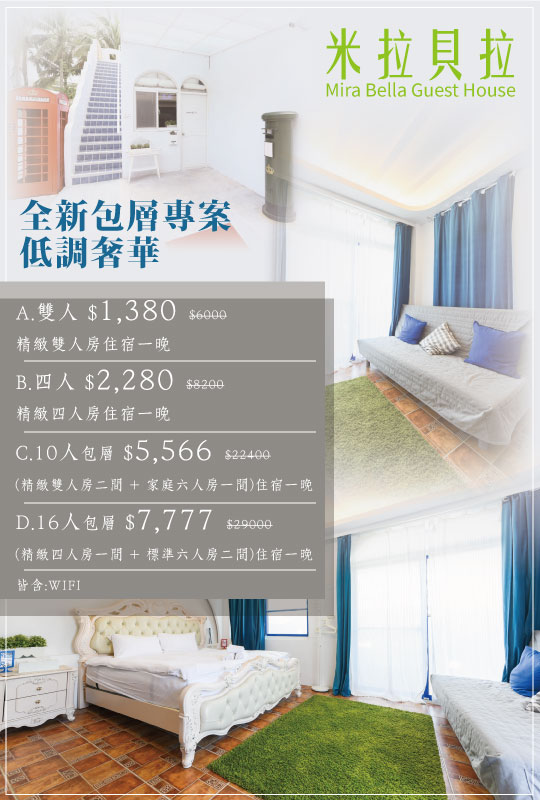 只要1380元起,即可享有【墾丁-米拉貝拉】全新包層專案!低調奢華A.雙人/B.四人/C.10人包層/D.16人包層〈含A.精緻雙人房/B.精緻四人房/C.(精緻雙人房二間 + 家庭六人房一間)/D.(精緻四人房一間 + 標準六人房二間) 住宿一晚 + WIFI + 早餐(地點於墾丁大街)〉