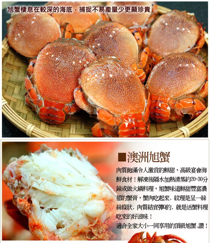 【優鮮配】嚴選澳洲母旭蟹15±2隻-2KG組是最近我買過算cp值蠻高的一個商品,下面是賣場提供的商品簡介: