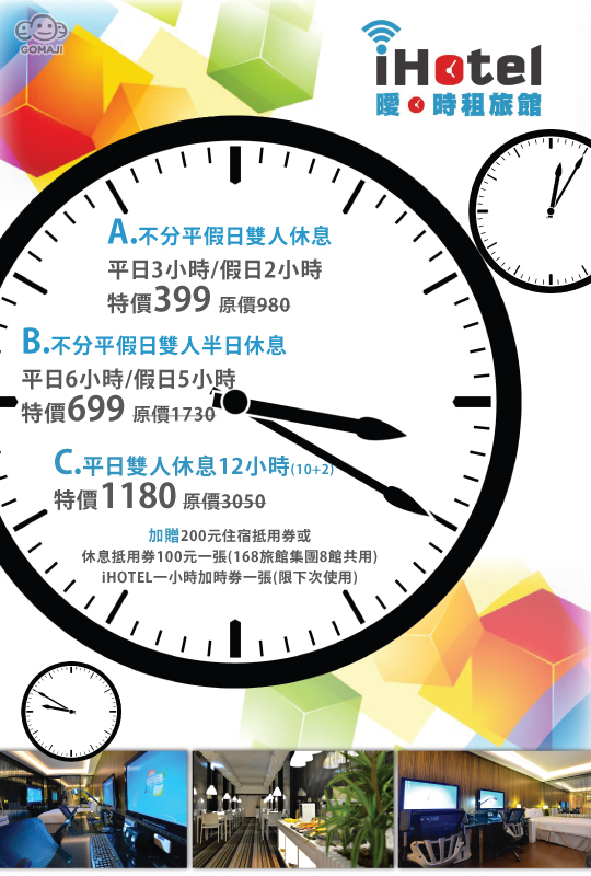 只要399元起,即可享有【桃園-iHOTEL曖時租旅館】A.不分平假日雙人休息專案(平日3小時/假日2小時)/B.不分平假日雙人半日休息專案(平日6小時/假日5小時)/C.平日雙人休息12小時(10+2)專案,加贈200元住宿抵用券或休息抵用券100元一張(168旅館集團8館共用) + iHOTEL一小時加時券一張(限下次使用)